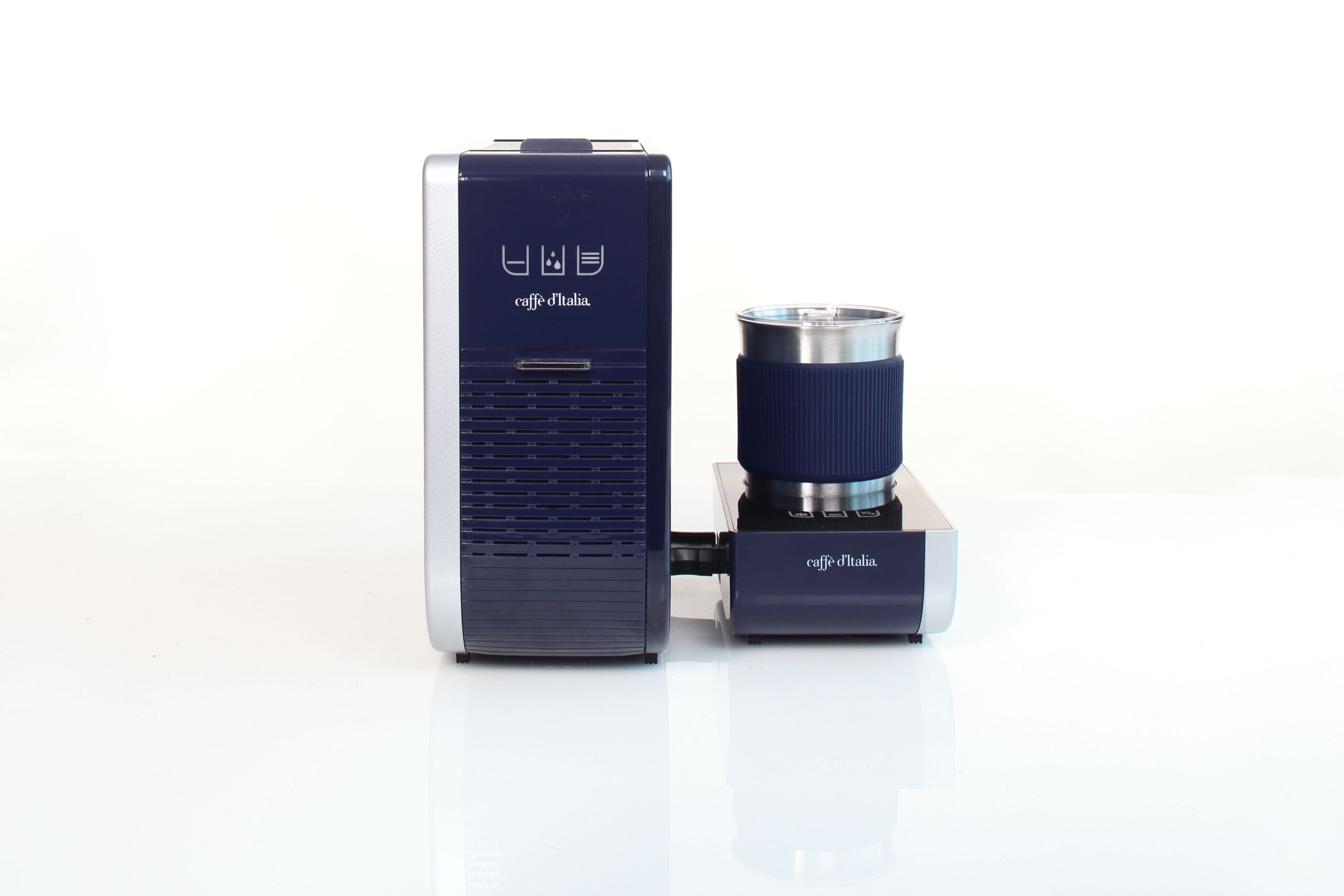 Designorientierte Kapselmaschine mit programmierbaren Kaffeemengen und optionalem Mago-Milchschaumer für Espresso und Milchgetränke.